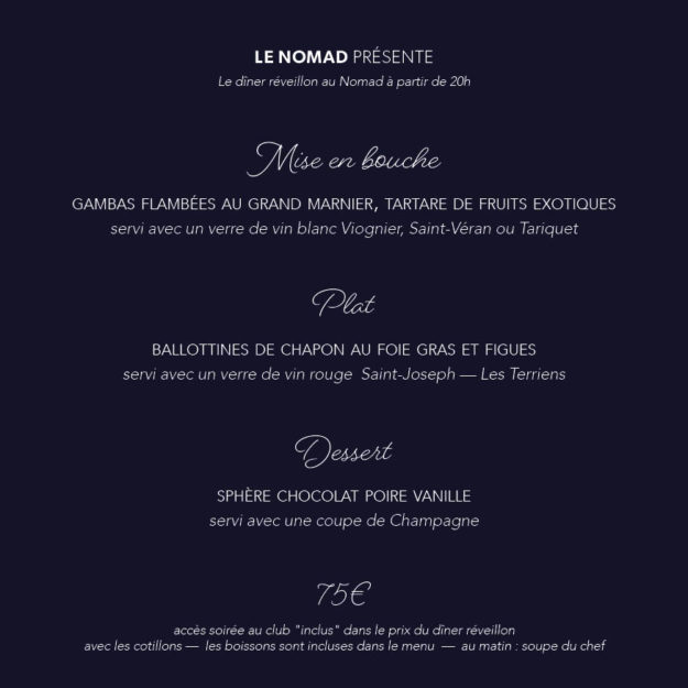 75€ accès soirée au club « inclus » dans le prix du dîner réveillon — avec les cotillons — les boissons sont incluses dans le menu — au matin : soupe du chef