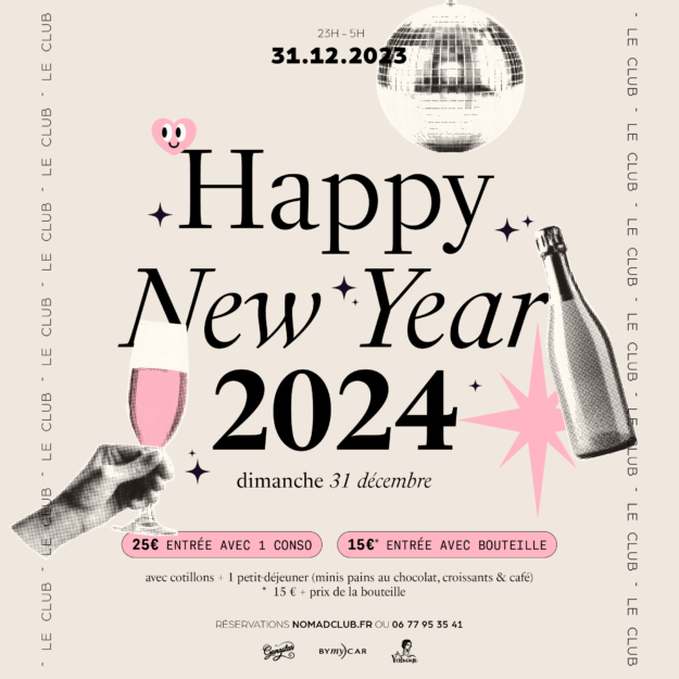 Happy New Year actualite-clubPar Nomad Club17 novembre 2023Dimanche 31 Décembre Entrée 15€ avec bouteille / Entrée 25€ sans bouteille / avec cotillons et petit-déjeuner (viennoiseries)